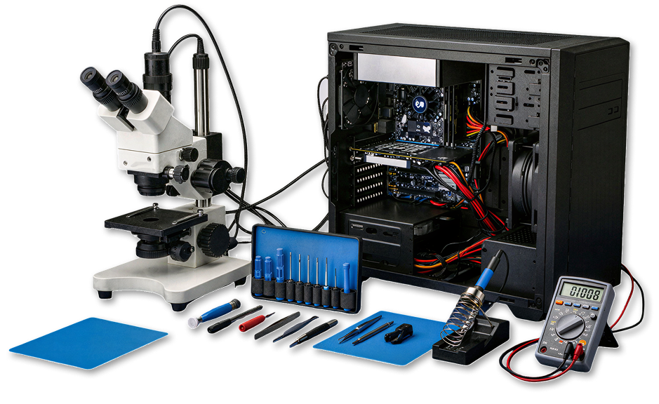 Atuamos no reparo de placas e componentes eletrônicos, buscando sempre a recuperação do equipamento.